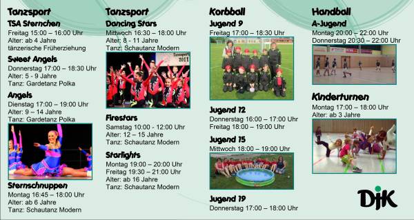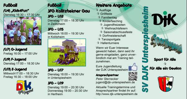 03.02.2012 Neuer Info-Flyer der DJK VereinsjugendZum Vereinsjugendtag 2012 wurde der neue Vereinsjugend-Flyer vorgestellt. Im 8-seitigen Faltblatt stehen alle Jugendmannschaften mit den Trainingszeiten und allgemeine Infos zur DJK Vereinsjugend. Der Flyer liegt im Sportheim und am neuen Info-Brett in der DJK-Sporthalle aus oder kann hier heruntergeladen werden. |
